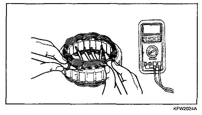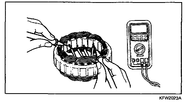 2. Check the coil for grounding. Check that there is no continuity between the coil and the core. If there is continuity, replace the stator assembly.