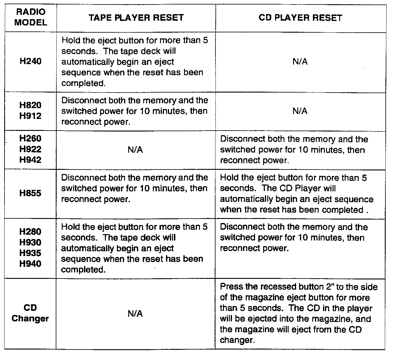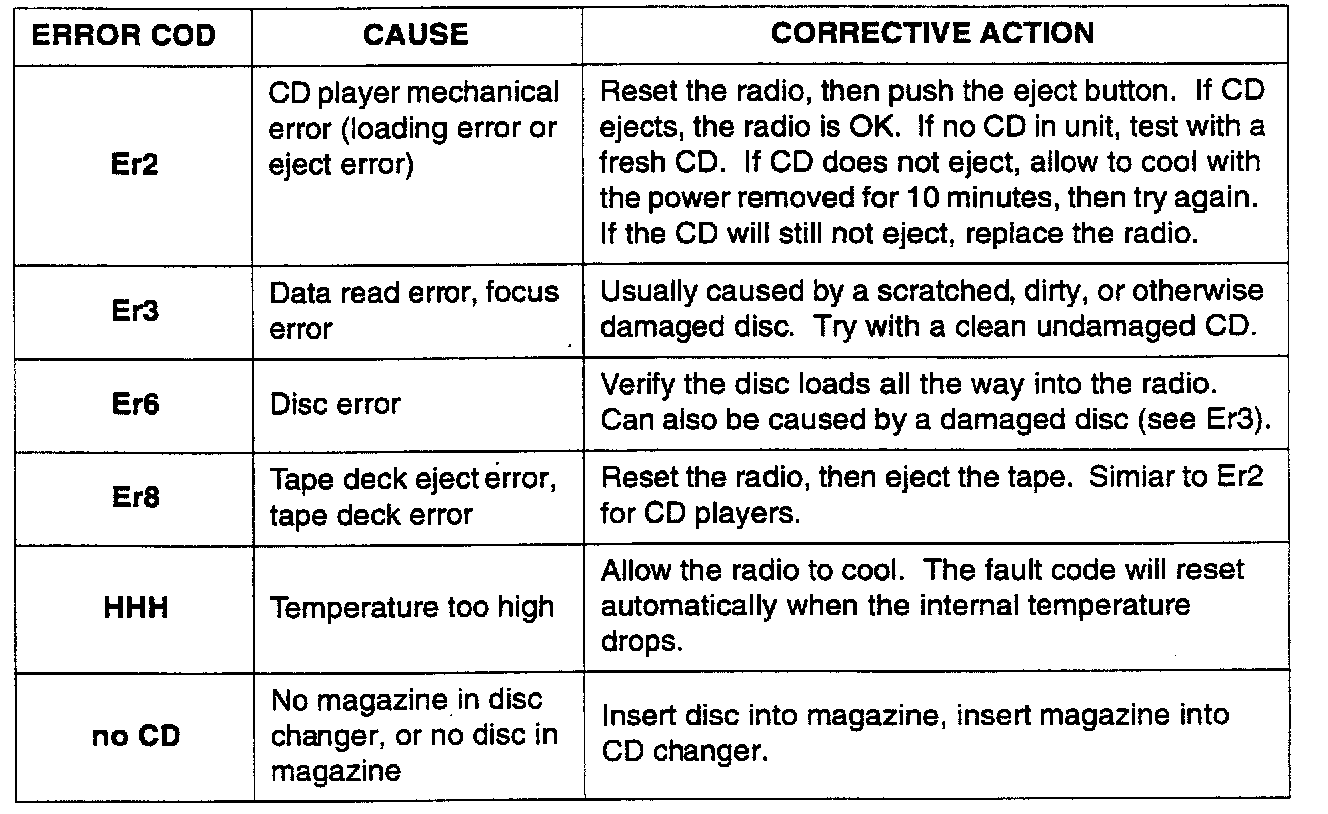 The error codes that may be displayed by a radio are published in the owner's manuals, not the shop manuals. This bulletin lists the codes and provides information about how to reset the radio for codes that require resetting. This bulletin does not replace the troubleshooting section of the shop manuals, which should be referenced when repairing the audio system.