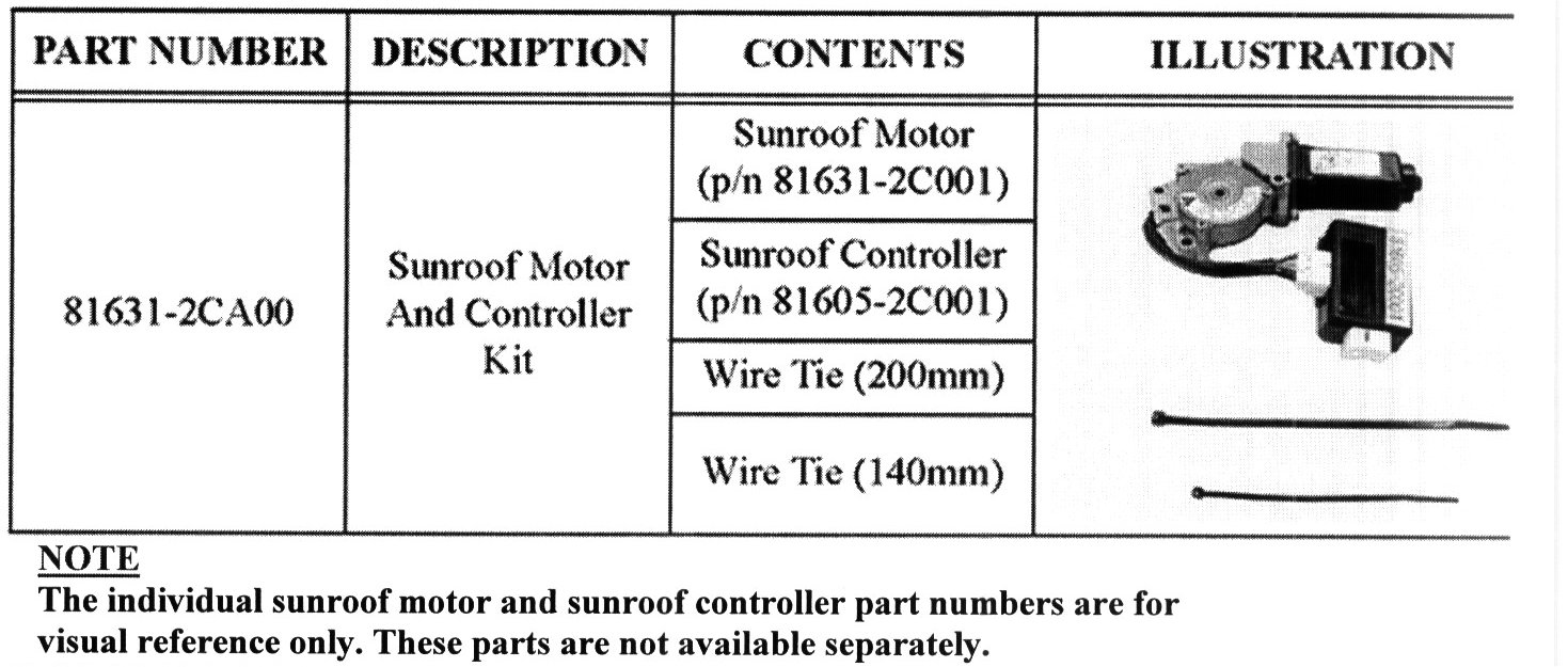 The replacement sunroof motor for the 2003 Tiburon has been revised. The sunroof controller and the sunroof motor must now be replaced as a set. A kit is available with the required parts packaged together.