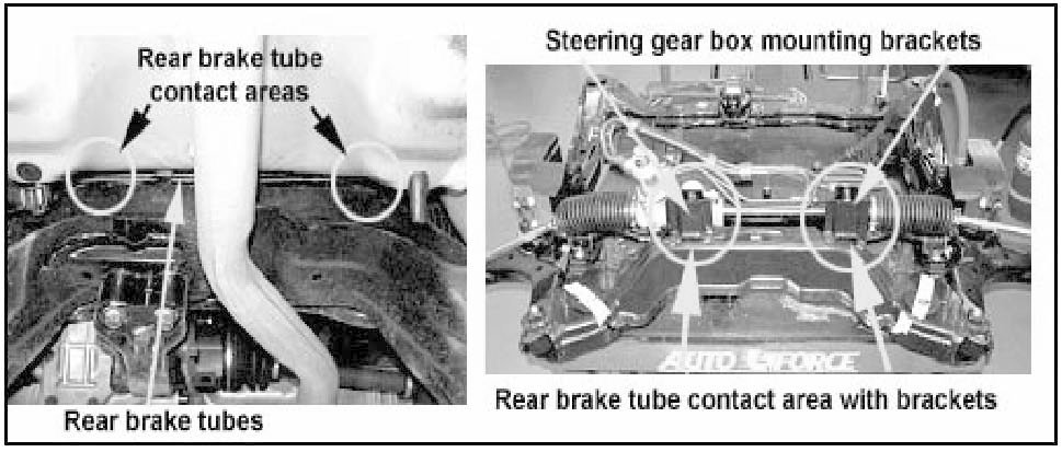 This bulletin provides the procedures that reposition the rear brake tubes to prevent contact with the front suspension cross member's steering gear box mounting brackets. The photos show the areas where the rear brake tubes may contact the steering gear box mounting brackets.