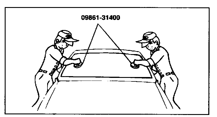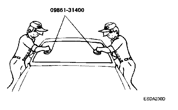 11. Using suction cups or the special tool (09561-31400), lower the glass over the opening, align it with the marks made in step 4 and set it down on the sealant.