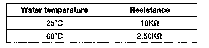 WATER TEMPERATURE SENSOR1. The water temperature sensor, located at the heater core, detects coolant temperature flowing through heater core. It is a negative type thermistor; resistance will increase with lower temperatures, and decrease with higher temperatures.
