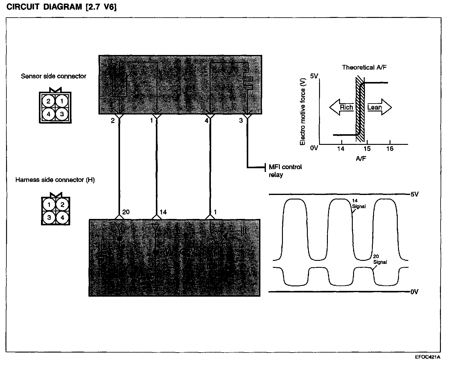 HEATED OXYGEN SENSOR (HO2S)The heated oxygen sensor senses the oxygen concentration in exhaust gas, converts it into a voltage, which is sent to the ECM. The oxygen sensor outputs about 0 V when the air fuel ratio is richer than the theoretical ratio, and outputs about 5 V when the ratio is leaner (higher oxygen concentration in exhaust gas.). The ECM controls the fuel injection ratio based on this signal so that the air fuel ratio is maintained at the theoretical ratio. The oxygen sensor has a heater element which ensures the sensor performance during all driving conditions.