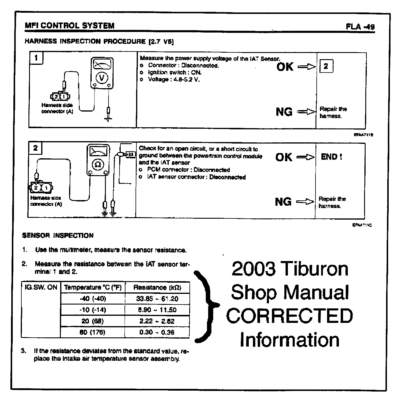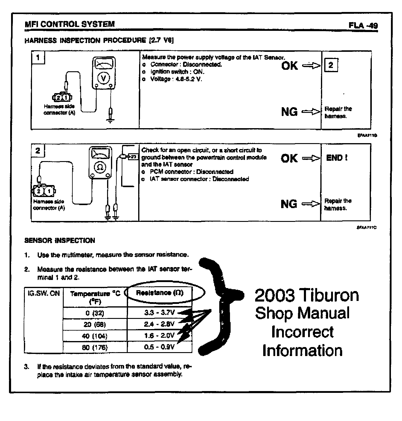 The 2003 Tiburon Shop Manual contains incorrect information for the Intake Air Temperature (IAT) Sensor internal resistance for the V6 Engine.