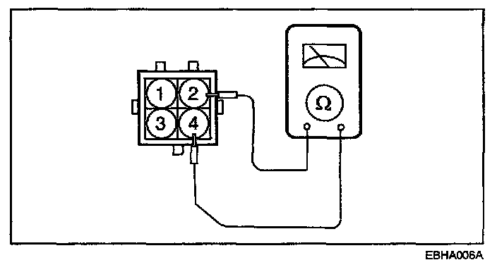 Measure the resistance between connector terminals 1 and 2 (the coils at the No. 3 and No. 6 cylinder sides) of the ignition coil, and between terminals 2 and 4 (the coils at the No.1 and No.4 cylinder sides), and between terminals 2 and 3 (the coils at the No.2 and No.5 cylinder sides).