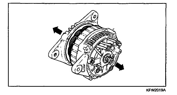 2. The rear cover may be hard to remove because a ring is used to lock the outer race of the rear bearing. To facilitate removal of rear cover, heat just the bearing box section with a 200-watt soldering iron. Do not use a heat gun as it may damage the diode assembly.