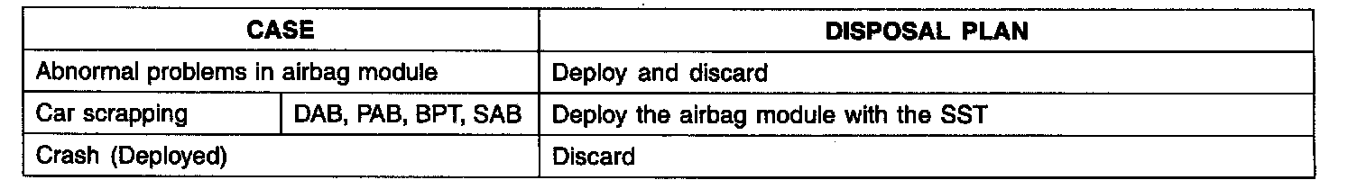 After deployment, the airbag module should be disposed of in the same manner as any other scrap part, except that the following points should be carefully noted during disposal.