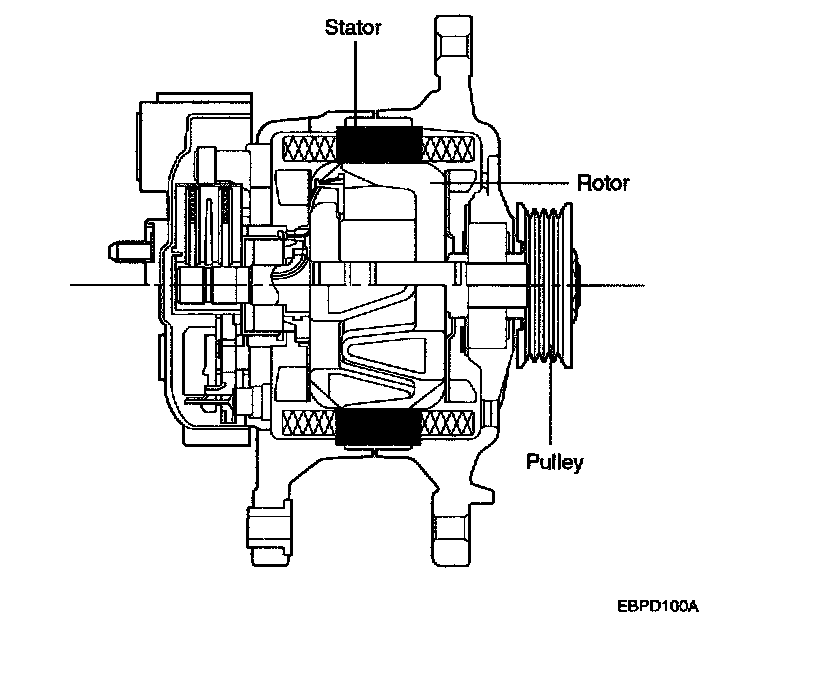 The generator is regulated by the battery voltage detection system. The main components of the generator are the rotor, stator, rectifier, capacitor brushes, bearings and V-ribbed belt pulley. The brush holder contains a built-in electronic voltage regulator.