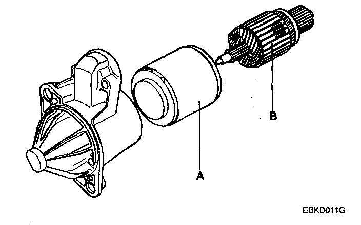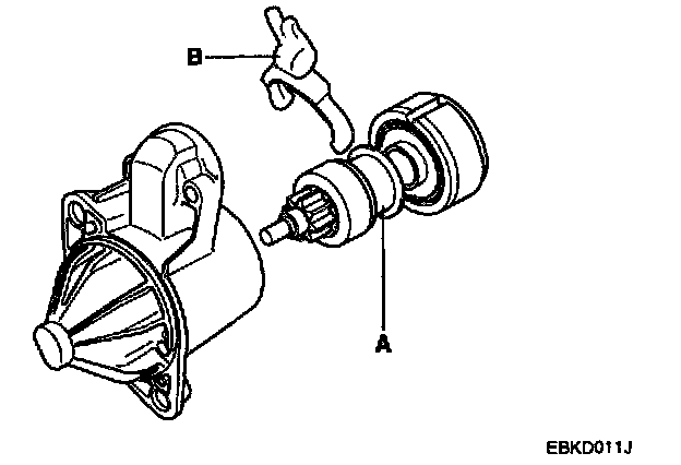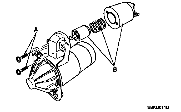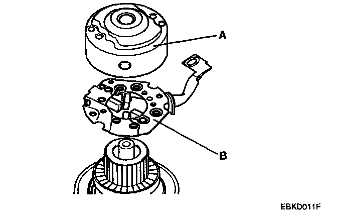 4. Remove the rear bracket(A) and brush holder assembly(B).