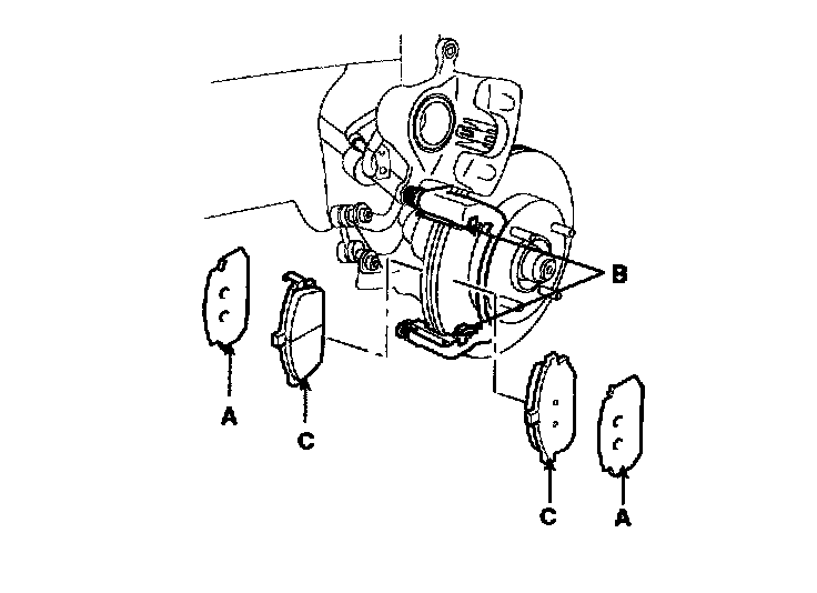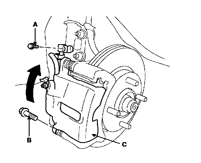 3. Remove guide rod (B) and the caliper (C) up out of the way. Check the hoses and pin boots for damage and deterioration.