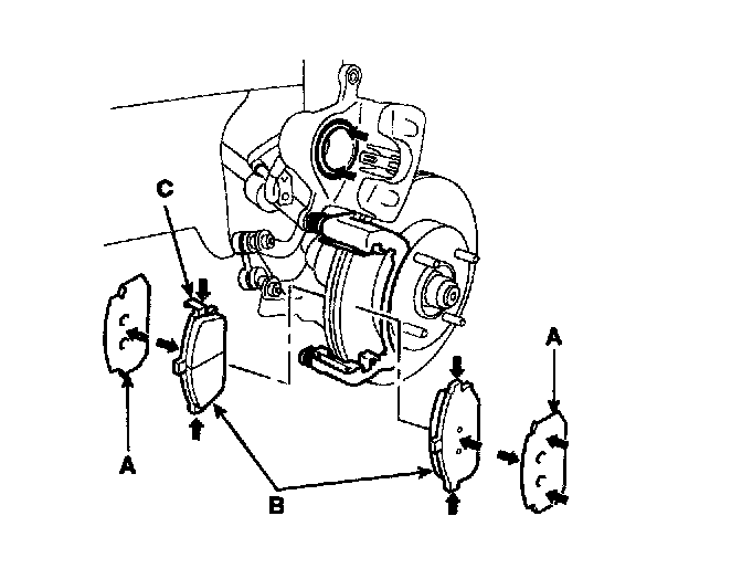 11. Install the brake pads (B) and pad shims (A) correctly. Install the pad with the wear indicator (C) on the inside.