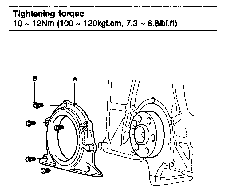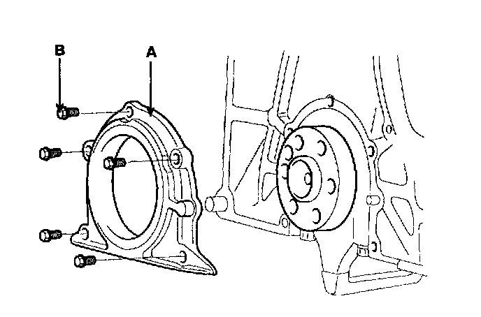 16. Remove rear oil seal case. Remove the 5 bolts (B) and rear oil seal case (A).