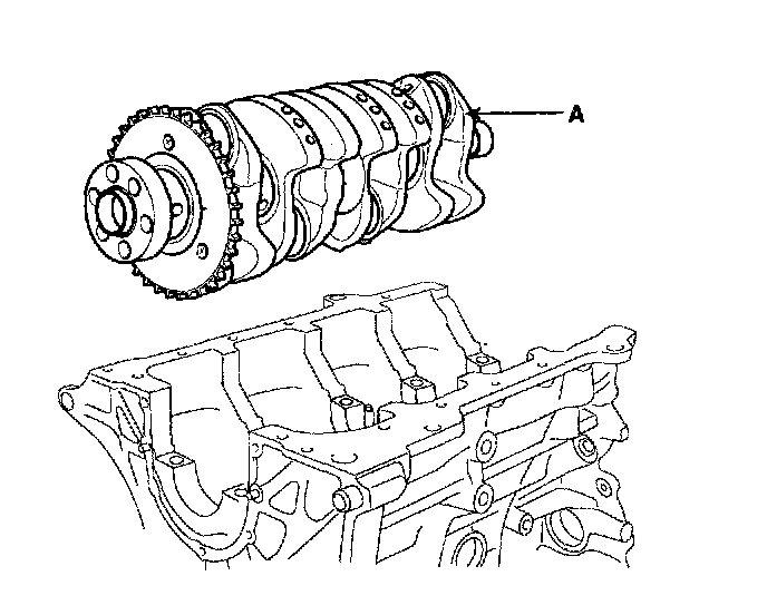 19. Lift the crankshaft (A) out of the engine, being careful not to damage journals.