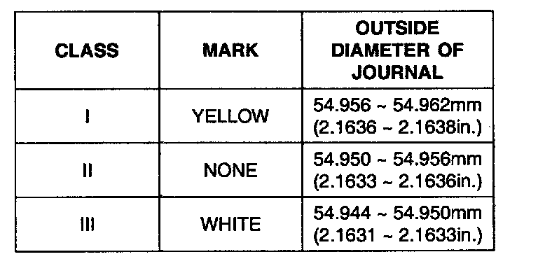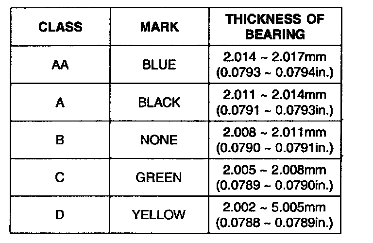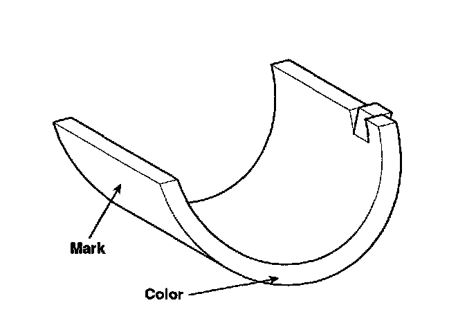 6. If the plastigage measures too wide or too narrow, remove the upper half of the bearing, install a new, complete bearing with the same color mark (select the color as shown in the next column), and recheck the clearance.