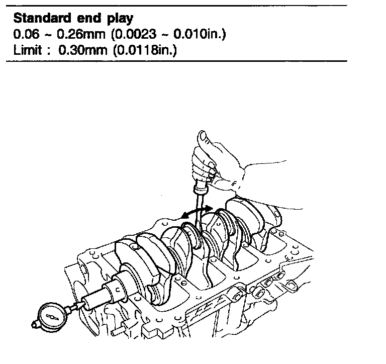 1. Check the connecting rod end play. Using feeler gauge, measure the end play while moving the connecting rod back and forth.