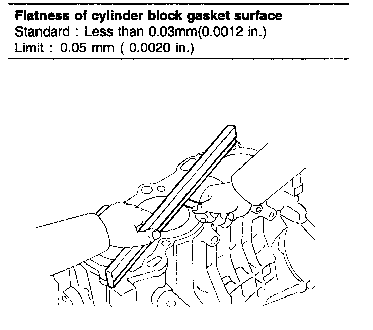 3. Inspect top surface of cylinder block for flatness. Using a precision straight edge and feeler gauge, measure the surface contacting the cylinder head gasket for warpage.