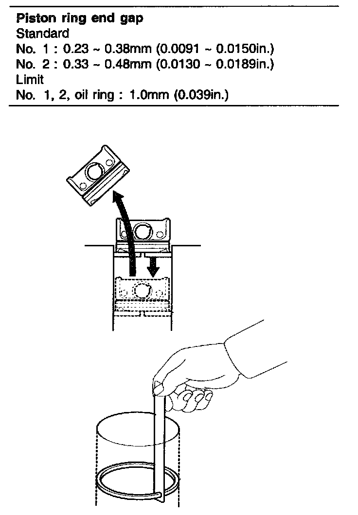 To measure the piston ring end gap, insert a piston ring into the cylinder bore. Position the ring at right angles to the cylinder wall by gently pressing it down with a piston. Measure the gap with a feeler gauge. If the gap exceeds the service limit, replace the piston ring. If the gap is too large, recheck the cylinder bore diameter against the wear limits, If the bore is over the service limit, the cylinder block must be rebored.