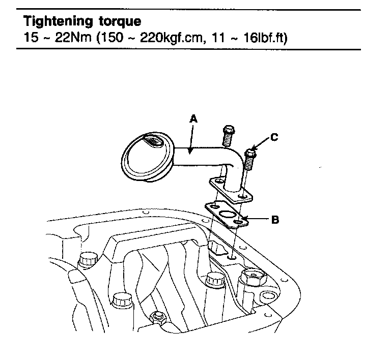 Install a new gasket (B) and oil screen (A) with 2 bolts (C).