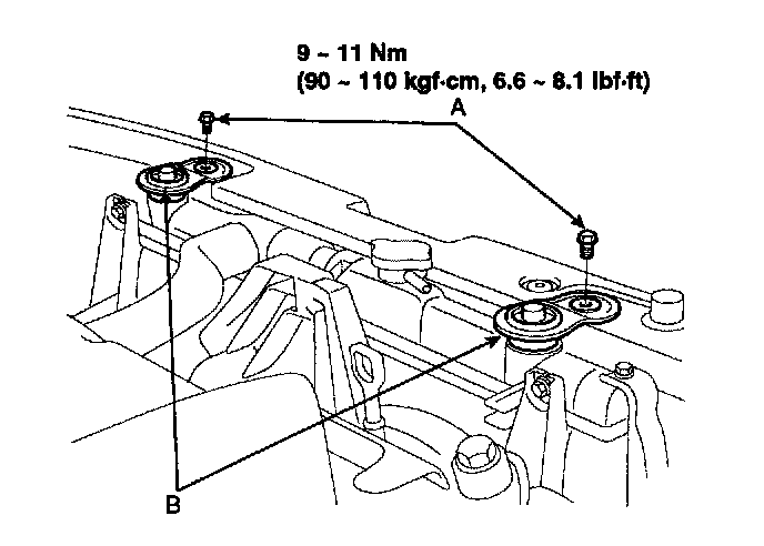 3. Remove the bolts (A), then remove the upper mount brackets (B) from the radiator.