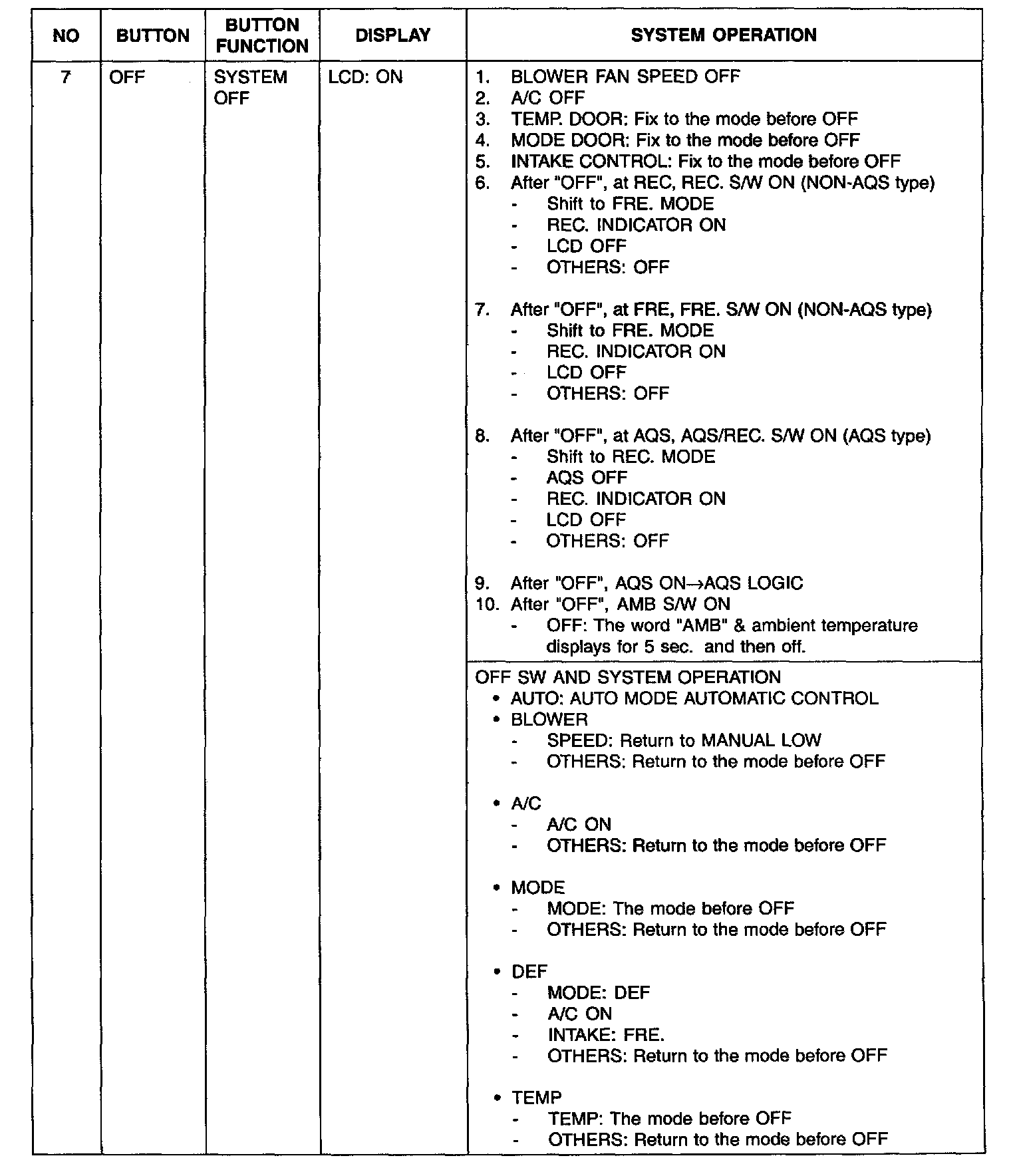 During mode control, the A/C may operate during DEF or MIX mode.In order to enable dehumidification, the driver may select A/C OFF during the A/C on condition