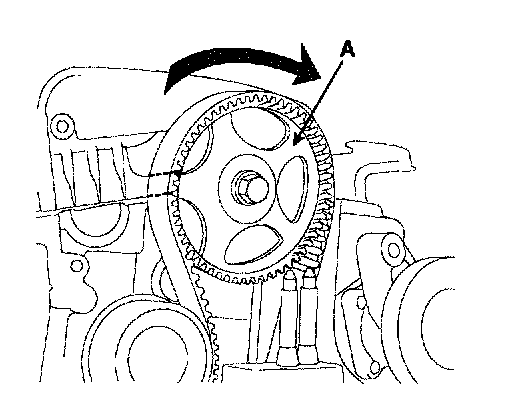 1. Rotate crankshaft in regular direction (clockwise view from front) through angle equivalent to two teeth (18°) of camshaft sprocket (A).