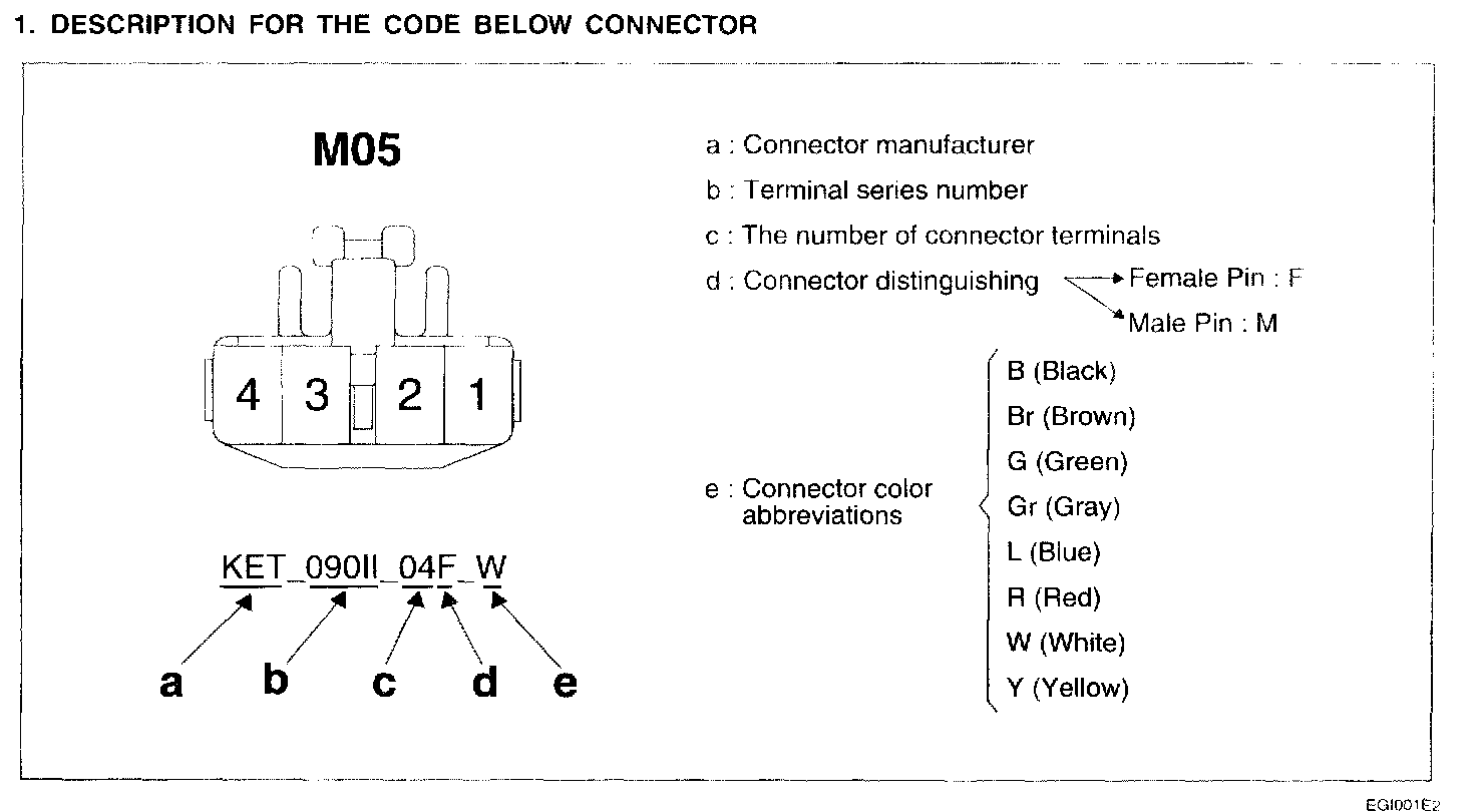This shows the cavity or terminal locations in all the multi-pin connectors shown in the schematic diagrams. It will help you to locate check points together with the wire colors and terminal numbers in the schematic. The configuration drawings show the connector view as seen from a component after the harness connector has been disconnected. When more than one connector is connected to a component, the connectors are all shown together. Both halves of in-line connectors are shown together.