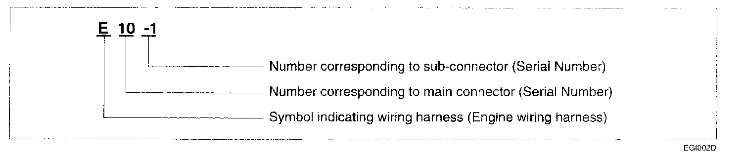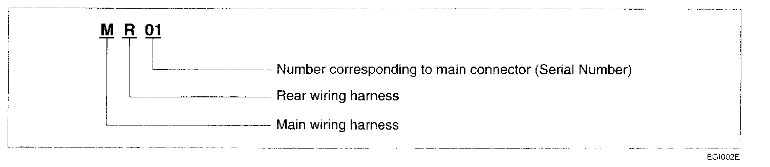 A connector identification symbol consists of a wiring harness location classification symbol corresponding to a wiring harness location and number corresponding to the connector. These connector locations can be found in the HARNESS LAYOUTS.For example