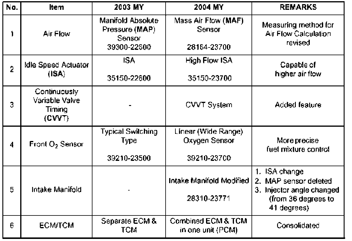 This bulletin describes the changes to the engine management/engine electrical system for the 2004 MY Elantra (versus the 2003 MY Elantra).