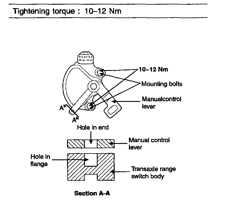4. Loosen the transaxle range switch body mounting bolts and then turn the transaxle range switch body so the hole in the end of the manual control lever and the hole (cross section A-A in the figure) in the flange of the transaxle range switch body flange are aligned.
