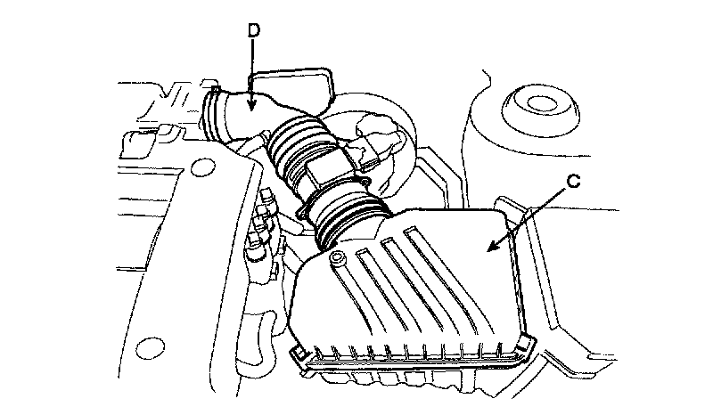 a. Air cleaner upper cover (C) and air intake hose (D).