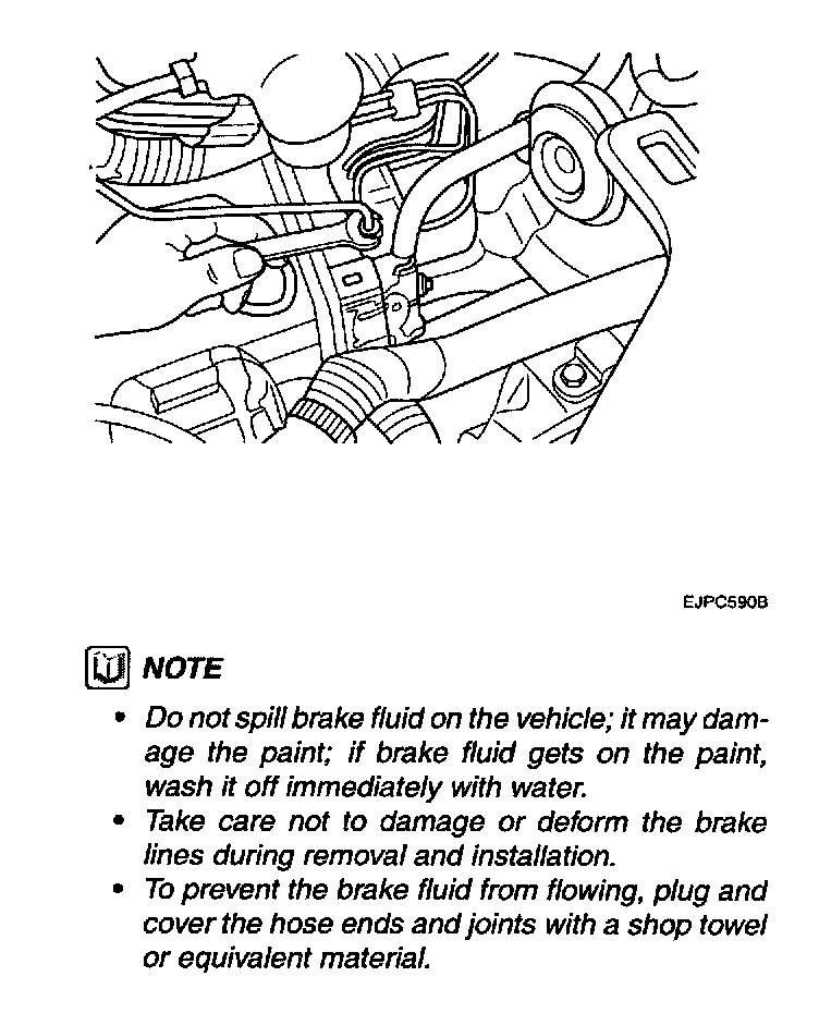 ^ To prevent the brake fluid from flowing, plug and cover the hose ends and joints with a shop towel or equivalent material.