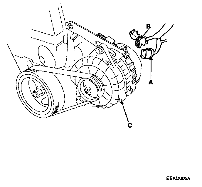 2. Disconnect the generator connector(A) and "B" terminal cable(B) from the generator(C).