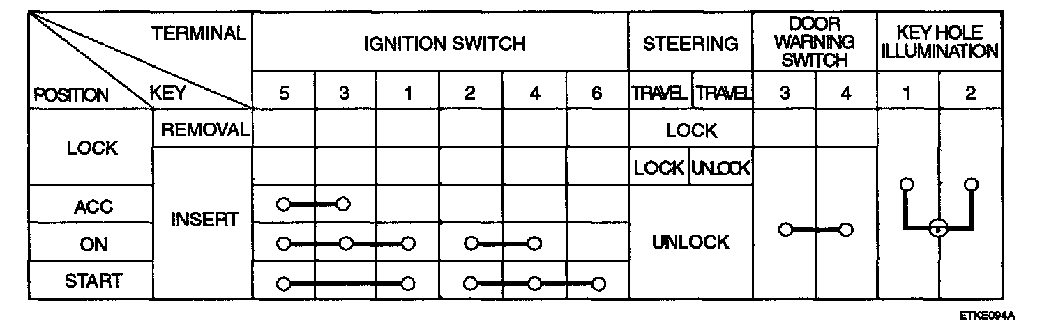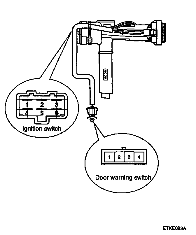 1. Disconnect the ignition switch connector and the door warning switch connector under the steering column.2. Check for continuity between the terminals.