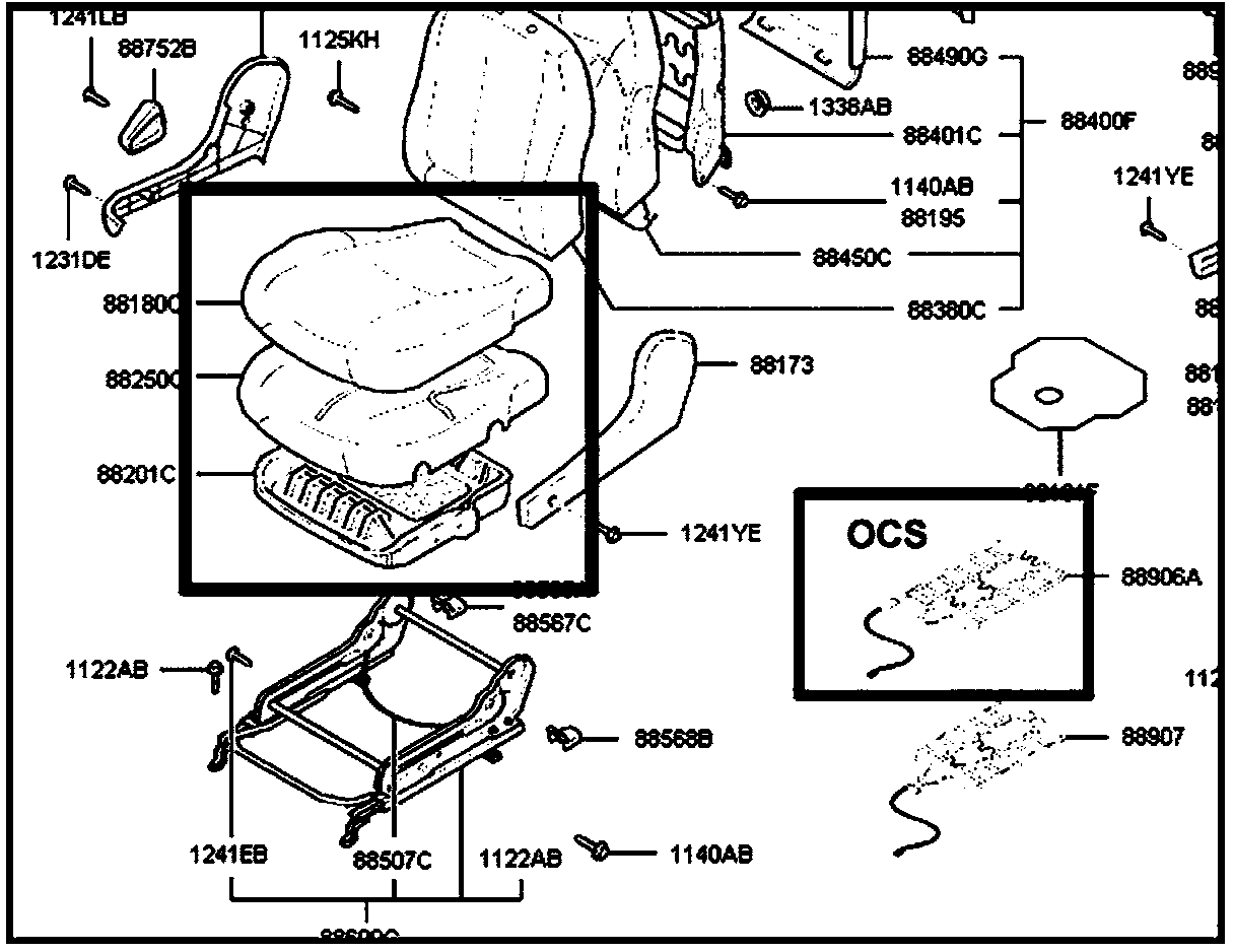 Replacement parts for the 2004 MY Elantra Occupant Classification System (OCS) sensor, right front seat cover, cushion and cushion frame are available only as the complete cushion assembly.