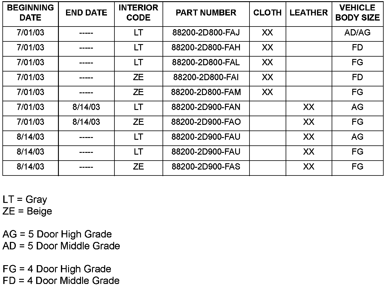 The information provided in this bulletin reflects the part numbers, application date vehicle application and cloth or leather seat distinction.