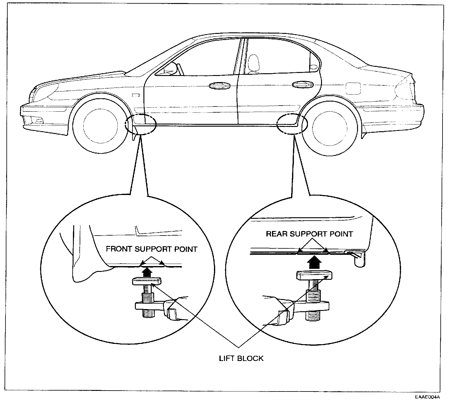 LIFT AND SUPPORT POINTWARNING: When heavy rear components such as suspension, fuel tank, spare tire, tailgate and trunk lid are to be removed, place additional weight in the luggage area before hoisting. When substantial weight is removed from the rear of the vehicle the, center of gravity may change and cam cause the vehicle to tip forward on the hoist.