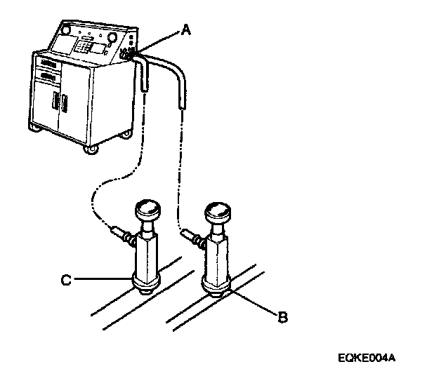 1. Connect a R-134a refrigerant recovery/recycling/charging station(A) to the high-pressure service port(B) and the low-pressure service port(C), as shown, following the equipment manufacturer's instruction.
