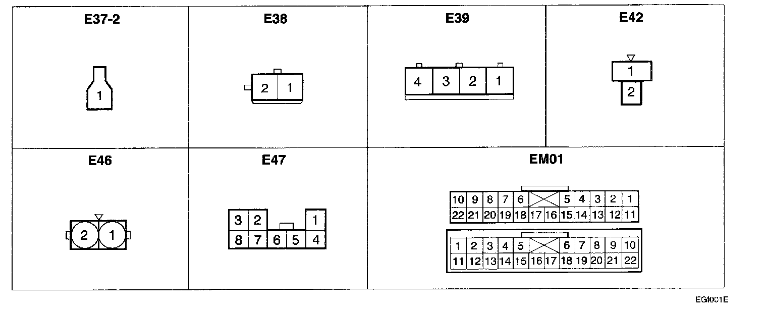 This shows the cavity or terminal locations in all the multi-pin connectors shown in the schematic diagrams. It will help you to locate check points, together with the wire colors and terminal numbers in the schematic. The configuration drawings show the connector view as seen from a component after the harness connector has been disconnected. When more than one connector is connected to a component, the connectors are all shown together. Both halves of in-line connectors are shown together.