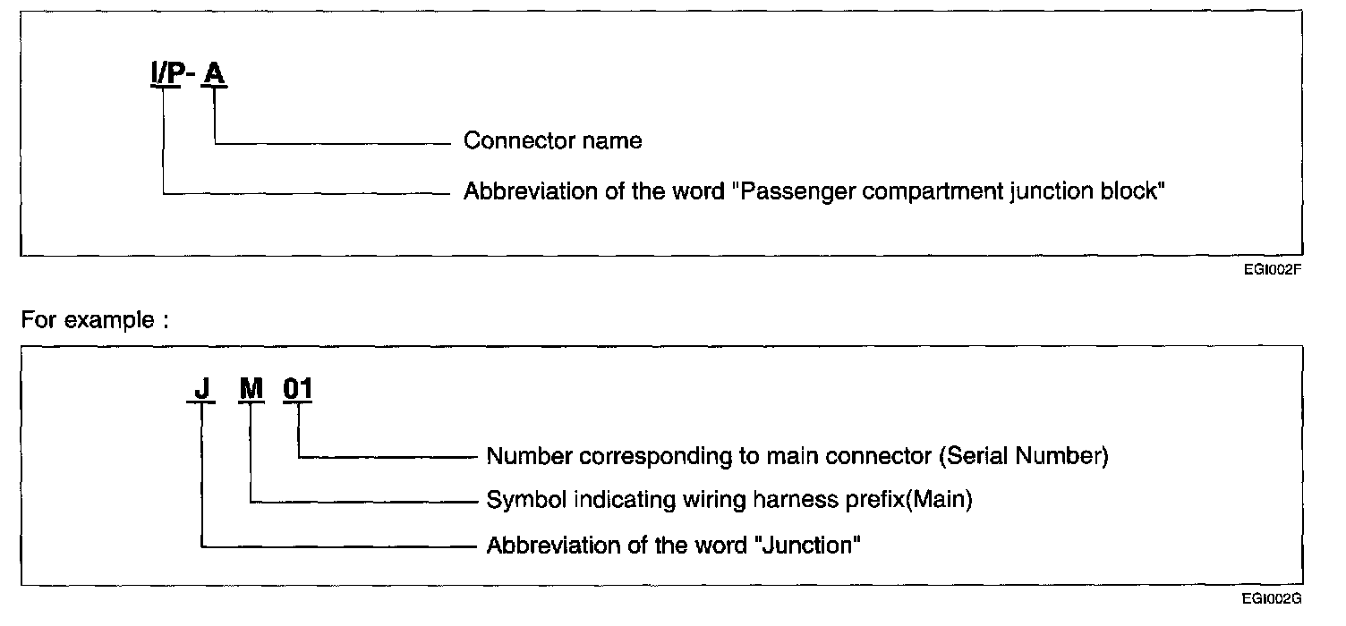 A junction block identification symbol consists of a wiring harness location classification symbol corresponding to a wiring harness location and number corresponding to the connector in the junction block.
