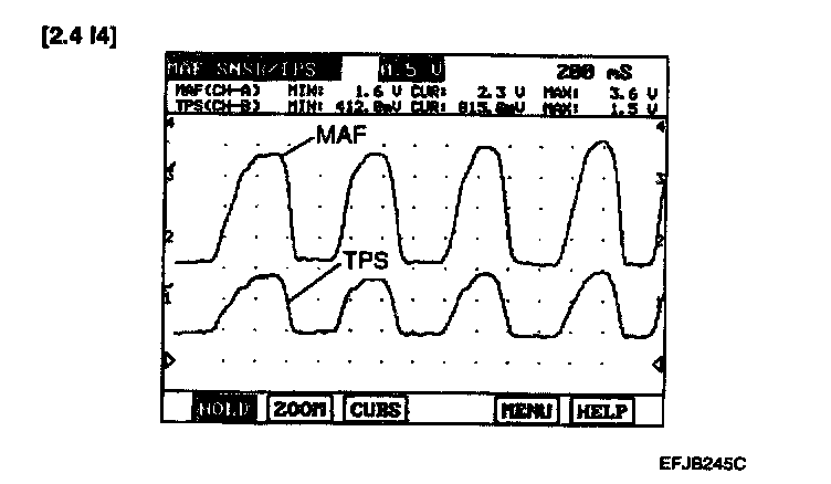 MAJOR SENSOR REFERENCE WAVE-FORMSThe followings are the major sensor reference wave-forms. Below is the data for CMP, Mass Air Flow Sensor, Throttle Position Sensor, Rear O2 Sensor, Front O2 Sensor and Injection Pulse when revving quickly up to 4800 rpm under no-load after warming up engine sufficiently. Each value is for reference, the exact values may vary.