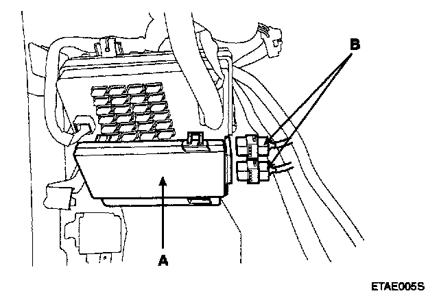 3. Remove the bolts holding the ETACS module(A) and disconnect the connectors(B).