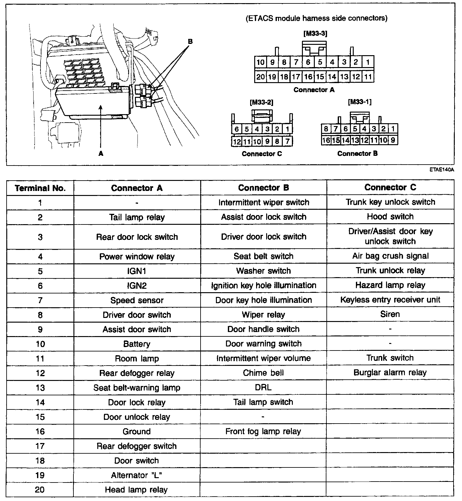 1. Disconnect the wire connectors(B) from the ETACS module(A).