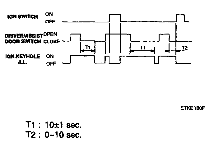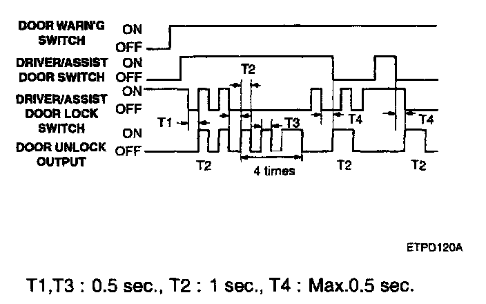 2. If the driver's door unlock switch or the assist door unlock switch is OFF to ON, the all doors' unlock output is ON for 0.5 second, (without burglar alarm system)