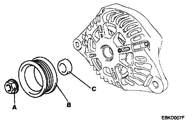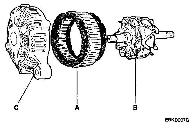 7. Disconnect the stator(A), rotor(B) and front bracket(C).