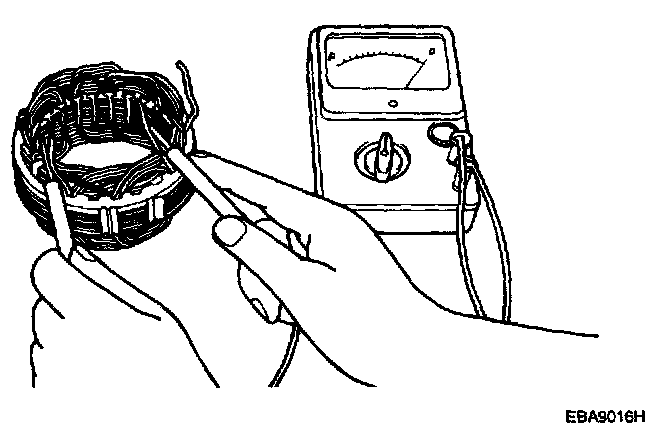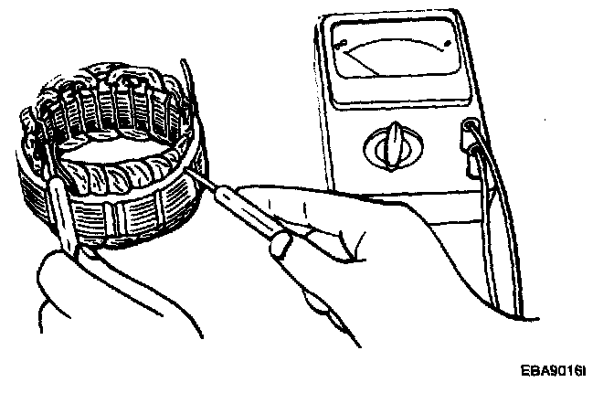 2. Check the coil for grounding. Check that there is no continuity between the coil and the core. If there is continuity, replace the stator assembly.