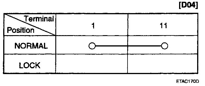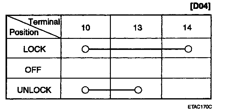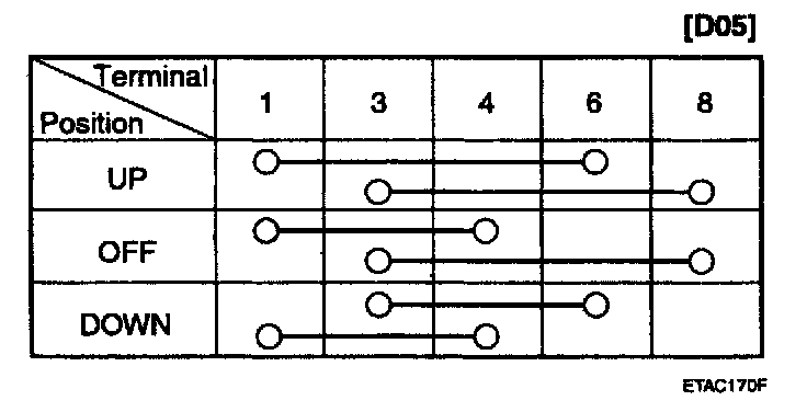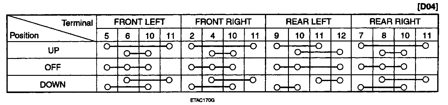2. Check for continuity between the terminals. If continuity is not as specified in the table, replace the power window switch.