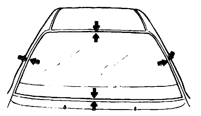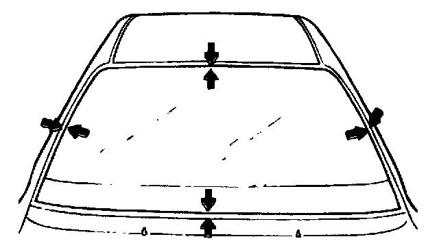 4. Center the new windshield glass in the opening. Mark the location by scribing lines across the glass and body with a grease pencil at the four points as shown.