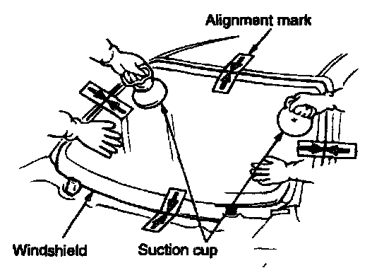 10. Using the suction cups or the special tool (09861 - 31400). Lower the glass over the opening to align it with the marks made in step 4 and set it down on the sealant. Insert two lower spacers to prevent the windshield from moving downward.