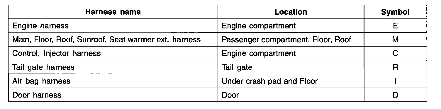 Electrical wiring connectors are classified according to the wiring parts in the Harness Layouts.