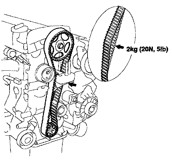 4. Recheck the belt tension, when the tension side of timing belt is pushed horizontally with a moderate force [approximately 2 kgf (20 N, 5 lbs.)], the timing belt cog end segs in approximately 4 - 6 mm (0.16 - 0.24 in.).